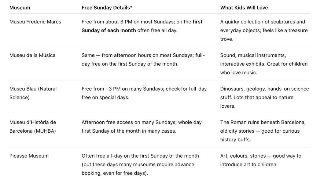 Here’s a secret many parents don’t know: some of Barcelona’s top museums open their doors for free on Sundays. From dinosaurs and Roman ruins to interactive sound labs, these cultural gems are not only fun and educational but also budget-friendly.